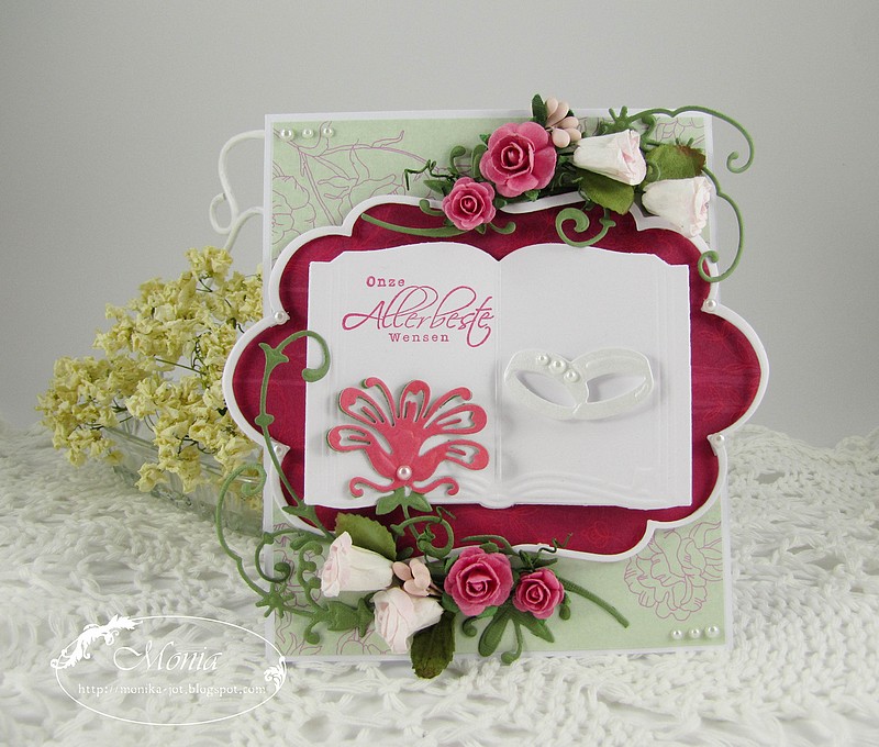 Księgę przykleiłam wewnątrz ramki wyciętej Marianne D - Wykrojnik Anja's Large Oval LR0236. Na księdze umieściłam obrączki Marianne D - Wykrojnik obrączki LR0238 oraz piękną gałązkę z kwiatem Marianne D - Wykrojnik LR0248. Na dole i górze kartki znajdują się kompozycje ułożone z Marianne D - Wykrojnik LR0249, róż JU0849, róż RB2206 i pręcików JU0853.