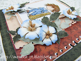Kwiaty powstały pod wpływem tej kartki. Dzięki niej przypomniałam sobie, że przecież też mam wykrojnik Marianne D LR0111, więc za jego pomocą zrobiłam z białego papieru czerpanego kwiatuszki. W ich środkach umieściłam pręciki Marianne D JU0858. Dodałam też śliczne listki z kwietniowych nowości Marianne D CR1244 i CR1245.
