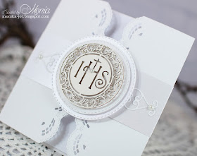Wycięłam oba brzegi wykrojnikiem brzegowym, treść zaproszenia nadrukowana jest na wkładce wewnątrz, a całość trzyma ozdobna opaska. Tutaj na opasce nakleiłam pięknie tłoczoną wycinankę Marianne D LR0366.