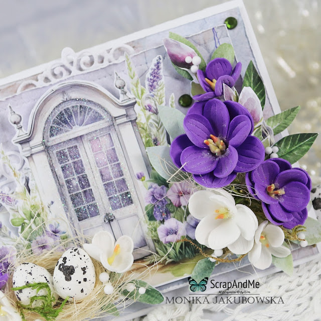 Dziś przychodzę z kolejnym świątecznym składaczkiem. Tym razem to prosta kartka schodkowa, której urody dodały produkty ze Scrapka. Na tylnej ściance przykleiłam ramkę okrągłą Gerda, na niej umieściłam choinki, a dokoła dodałam śnieżynki. Na pierwszym schodku wśród kwiatów z foamiranu i dwóch kolorów 10mm różyczek umieściłam zimowe gałązki oraz latarenkę z zestawu Nastrój świąteczny. Całość jest roziskrzona, bo dodałam też dwa kolory brokatu.